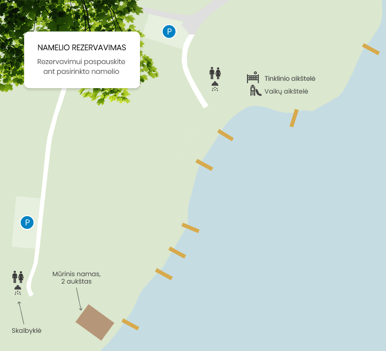 Namelio prie ežero rezervavimas: čia galite rezervuoti vieną (ar daugiau) iš 17 renovuotų namelių su patogumais, esančių 10-20 m. nuo ežero kranto. Nameliuose gali apsistoti 4 asmenys, studijoje – iki 6. Nameliuose Nr. 1-3 gali apsistoti 2-3 asmenys. Iš kiekvieno namelio matomas ežeras. Nameliuose yra 2 miegamieji, virtuvėlė su indais, terasos.